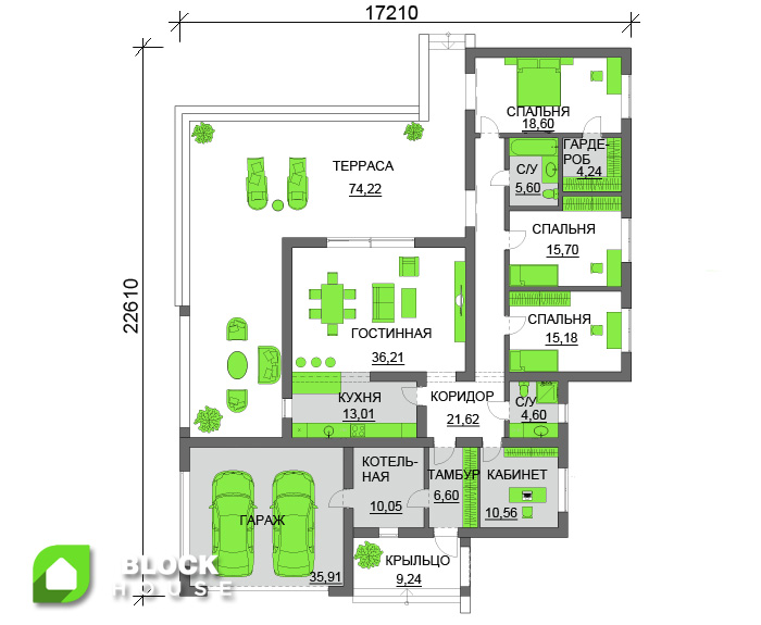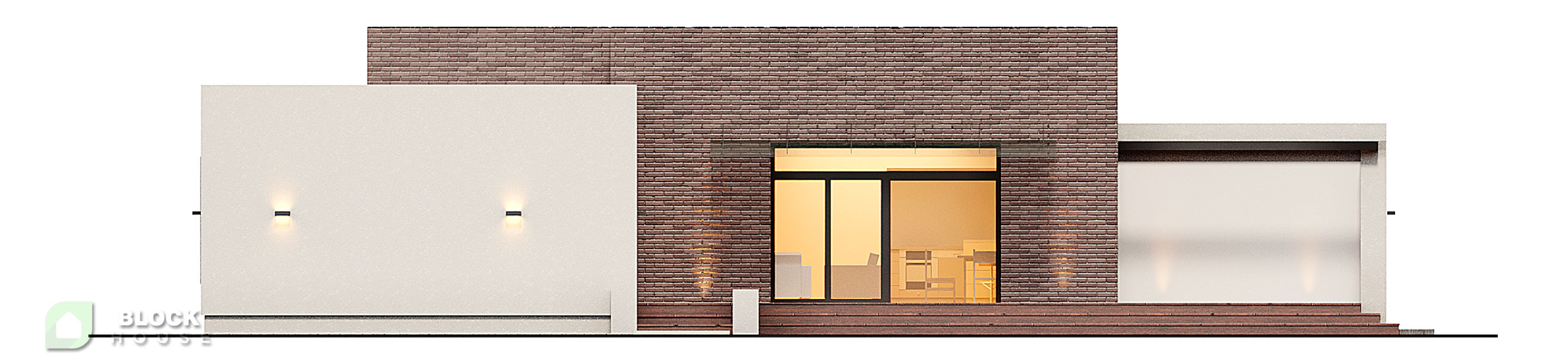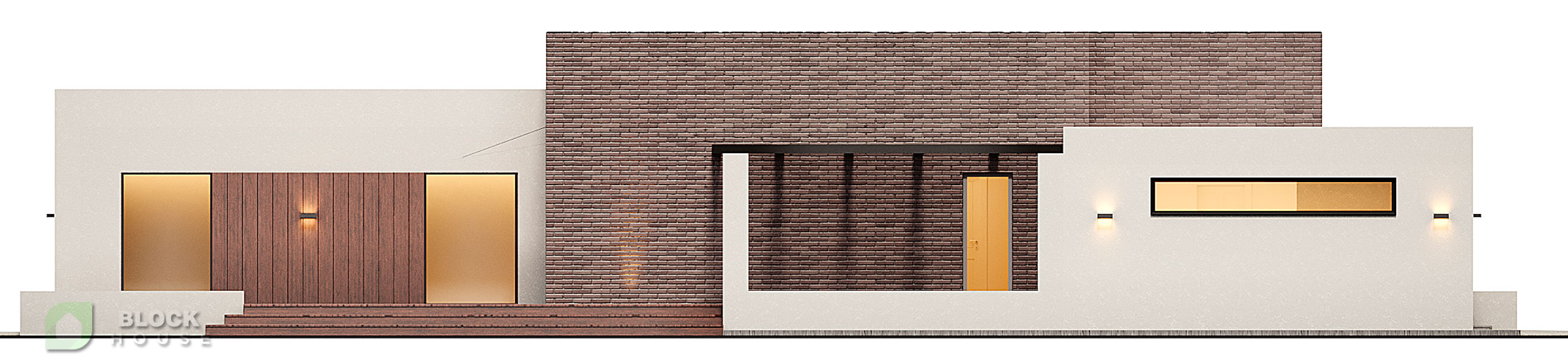 Современный проект одноэтажного дома с объединенным пространством гостиной и кухни, 3 спальни в одной из спален имеется отдельное помещение гардеробной, 1 кабинет, 2 санузла, гараж для 2 автомобилей, большая терраса для комфортного времяпровождения в летнее время.